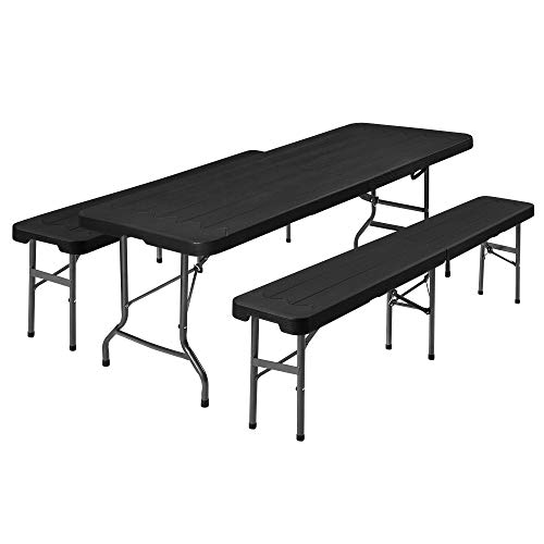 SONGMICS Bierzeltgarnitur, 180 x 74 x 75 cm, klappbares Gartenmöbel-Set, Gartentisch, mit imitierter Holzmaserung, aus Kunststoff, 2 passende Bänke, Terrasse, Gartenparty, Bierzelt, schwarz GPT62BK