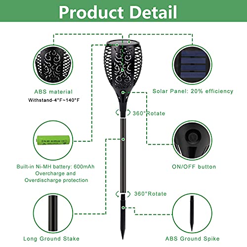 🔥【IP65 Wasserdicht und Weit Verbreitete 】Hergestellt aus hochwertigem ABS Kunststoff sind die kompakten Gartenfackeln, Entworfen mit schutzart ip65, die das ganze Jahr über allen Wetterbedingungen standhalten. Sie können es in Wege, Pool, Garten, Bank, Terrasse, Zaun, Deck, Party, Grillfeste, Camping, Hochzeit oder jeder outdoor-umgebung verwenden.