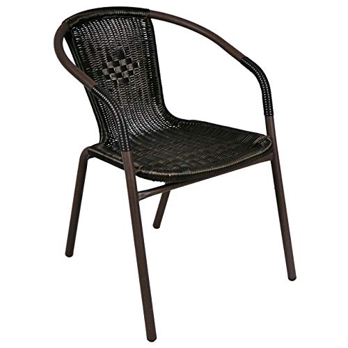 Das Gestell besteht sowohl beim Stapelstuhl als auch beim Gartentisch aus pulverbeschichtetem Stahl in Hammerschlag-Optik. Das dunkelbraune Polyrattan der Stühle besteht aus Kunststoff, ist reißfest und interessant geflochten. Ein Rattanstuhl hat ein Gesamtmaß von ca. 73 x 53 x 60 cm, ein Gewicht von ca. 3,5 kg und eine Sitzfläche von ca. 42×38 cm. Der Tisch misst im Ø 80 cm, in der Höhe: ca. 75 cm.