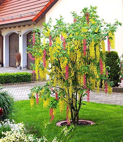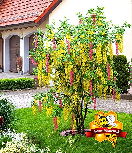 Bei der normalen Veredelung von Purpur-Ginster durch Pfropfung auf Gewöhnlichen Goldregen entstand 1825 in der Baumschule von Jean-Louis Adam bei Paris durch Zufall in einem Nebenspross diese merkwürdige neue Pflanze, die mitunter Zweige mit drei verschiedenen Blütentrauben am selben Ast (!) hervorbringt: Pink-rosEfarbene Misch-Blütentrauben, reine gelbe Goldregen-Blütentrauben sowie kurze purpur-rosarote Ginster-Blütentrauben. (50-60 cm). (Laburnocytisus adamii)
