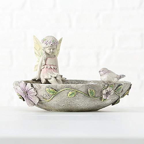 VINTAGE: Das besondere Design im Vintage-Look des Vogelbads wird durch die auf dem Rand sitzende Elfe und den Vogel aus sowie die Blumenranken, die die Schale verzieren, unterstrichen.