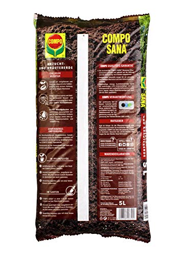 Gebrauchsfertige Spezialerde inklusive Start-Düngung für bis zu 6 Wochen, Ideal für die Aussaat und Vermehrung von Pflanzen sowie zur Kultivierung von Kräutern in Töpfen, Schalen oder Beeten – Sichere Keimung und kräftiges Wachstum: Optimale Nährstoffversorgung dank enthaltener Start-Düngung, Sehr gute Wasseraufnahme, Besonders feine und lockere Struktur durch Perlite-Atmungsflocken und spezielle Aufbereitung, Mit Wurzel-Aktivator AGROSIL – Einfache Handhabung: Leichtes Auflockern der Erde, Befüllung des Gefäßes mit Erde bis ca. 1 cm unter den Rand, Ausbringung der Aussaat, Übersiebung mit dünner Schicht Erde, Leichte Bewässerung – COMPO Qualitätsgarantie: Ausgesuchte Rohstoffe nach Original COMPO Rezeptur, Angenehmer Geruch, Strenge Qualitätskontrolle durch die unabhängige Untersuchungs- und Forschungsanstalt der Landwirtschaftskammer (LUFA) – Lieferumfang: 1 x 5 Liter Beutel COMPO SANA Anzucht- und Kräutererde inklusive 6 Wochen Nährstoffversorgung, pH-Wert: 5,0 – 6,5, Art.-Nr.: 10620