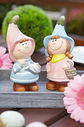 GARTEN-DEKO: Das süße Zwergenpaar aus Keramik mit Blütenmützen ist die ideale, klassische Gartendeko. Liebevoll gestaltet und bemalt bringen sie Freude, aber auch etwas Nostalgie in Ihren Garten und Ihr Haus. Die Gartenzwerge kommen in den Farben Rosa und Blau mit braunen Schuhen