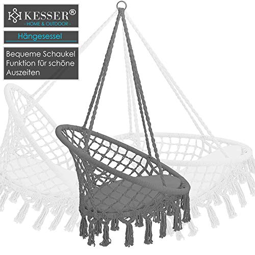 KESSER® Hängesessel 150kg mit 2 Stahlringe Sitzpolster geflochten Fransen Hängestuhl Hängekorb Schaukelkorb Garten Indoor wetterfest, wasserabweisend, Grau