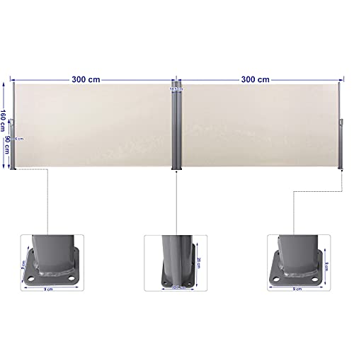 Praktische Doppelseitenmarkise: Die Seitenmarkise ist beidseitig ausziehbar, Sie können eine Seite alleine nutzen oder beide zusammen – gerade oder angewinkelt. Die Länge je Seite beträgt 3 m, insgesamt 6 m (inkl. Markisenkasten und -pfosten)
