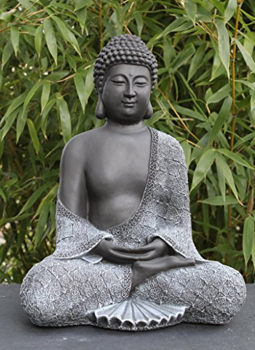 AISATISCHER FLAIR FÜR BALKON UND GARTEN: Besonders gut macht sich die grau-schwarze Buddha Figur (Artikelnr.: 436-9) mit den Maßen 14 x 22 x 29 cm und einem Gewicht von 4,5 kg in Kombination mit Bambus, Schilf oder Lilien auf jedem Balkon und in jedem Garten