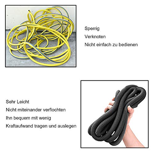 Unterschied:Der Schlauch ist mit einer Art Stoff ummantelt und ist in leerem Zustand sehr leicht. Im Gegensatz zu konventionellen Gartenschläuchen ein Unterschied wie Tag und Nacht.Verknoten ist aufgrund der flexiblen Ummantelung nahezu unmöglich.